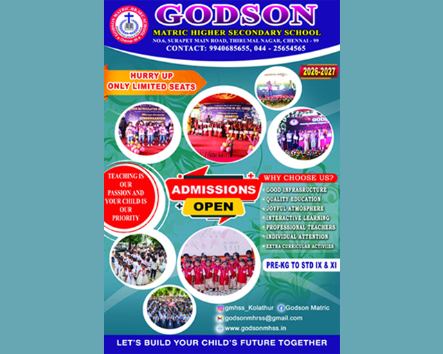 Godson Matriculation Higher Secondary School provides state of the art facilities to its students and staff members to encourage and support all their activities. It has a well stocked library, laboratories for Science and Computers. Sports facilities include outdoor and indoor games such as Kho-Kho, Kabaddi, Throw Ball, Tennikoit, Volley Ball, Yoga/ Meditation, Aerobics, Chess, Carrom etc., Read More