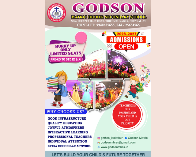 Godson Matriculation Higher Secondary School provides state of the art facilities to its students and staff members to encourage and support all their activities. It has a well stocked library, laboratories for Science and Computers. Sports facilities include outdoor and indoor games such as Kho-Kho, Kabaddi, Throw Ball, Tennikoit, Volley Ball, Yoga/ Meditation, Aerobics, Chess, Carrom etc., Read More